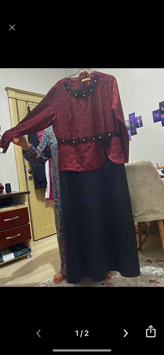 Bordo renkli, uzun kollu ve yüksek yakalı uzun elbise. Desenli, dökümlü saten üst kısmı ve siyah etek kısmıyla mütevazı, bohem tarzda günlük kullanıma uygun.