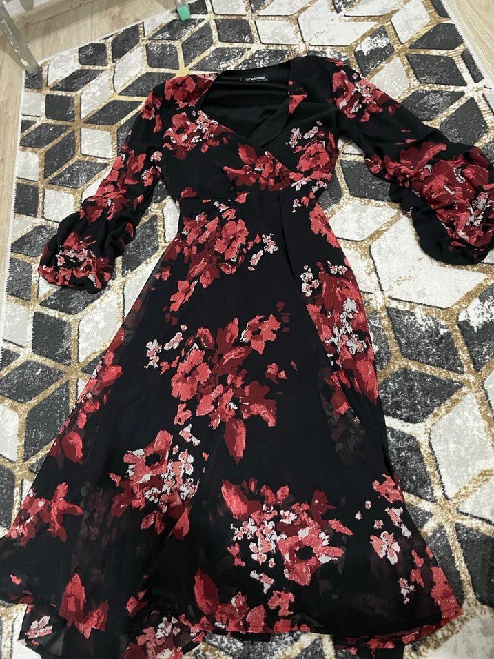 Bordo renkli, drapeli tasarıma sahip uzun kol ve V yaka detaylı uzun elbise. Koyu çiçek desenleri ve sentetik kumaşıyla cesur, bohem gotik tarzı yansıtıyor, düğünler için uygun.