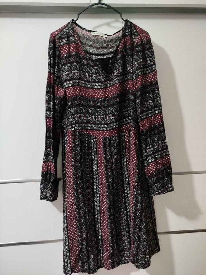 Bordo renkte, uzun kollu ve V yaka bohem elbise. Yumuşak sentetik kumaştan, örme desenli ve bol kesim, günlük kullanıma uygun.