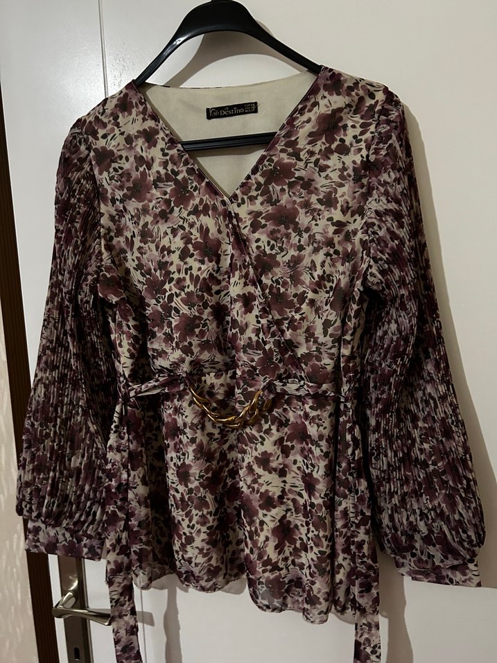 Bordo ve gri tonlarında tie-dye desenli, V yakalı, uzun kollu, bol kesim kadın bluz. Belinde kemer ile midi boyda, günlük kullanıma uygun.