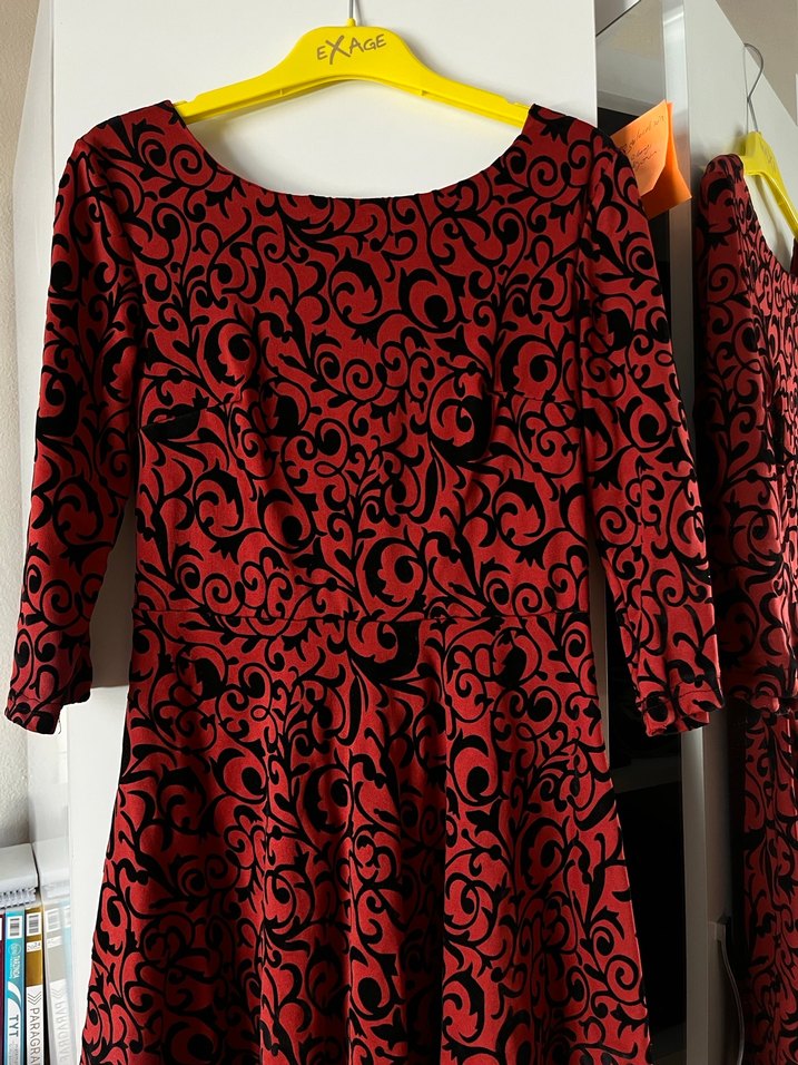 S/M Beden.Koyu kırmızı zemin üzerine siyah desenlerle süslü, tekne yaka ve yarım kollu drapeli, pileli kısa henna elbise. ✨