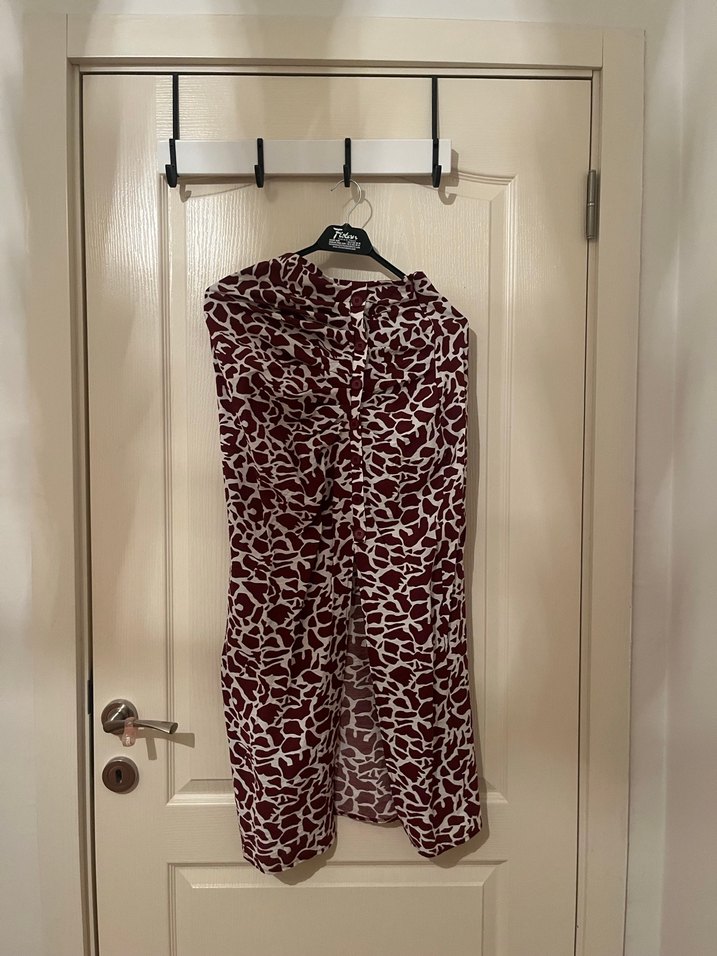 Bordo renkli, yılan desenli uzun kalem etek, drapeli ve vücuda oturan kesimiyle bohem ve retro tarzlar için uygun, kolsuz ve çağdaş bir tasarıma sahiptir.