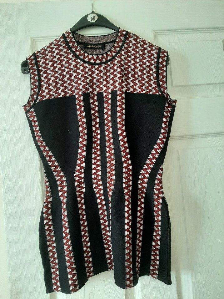 Bordo desenli, kolsuz ve yüksek yakalı triko elbise, midi boyda ve günlük kullanıma uygun şık bir parça. marka temsili