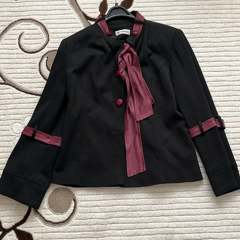 Bordo detaylı, düğmeli, kısa kesim kadın blazer.