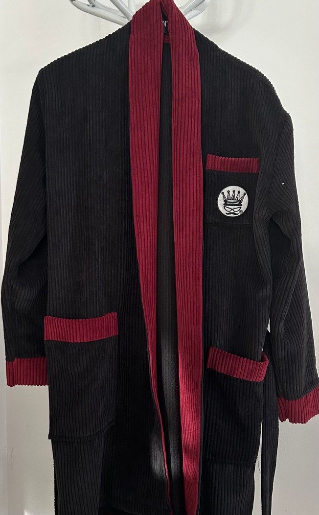 Exclusive collection marka S beden ( boy 97 cm, kol 59 cm koltuk altı 54 , ) siyah renk , yakası ve bilek kısmı bordro renk , geniş kesim , kuşaklı erkek kadife sabahlık . Bir kez denendi. Kullanılmadı. Siyah kadife sabahlık , bordo detaylı yaka, manşet ve cepleriyle sokak stili sunar. Göğüs cebinde amblem bulunur.
