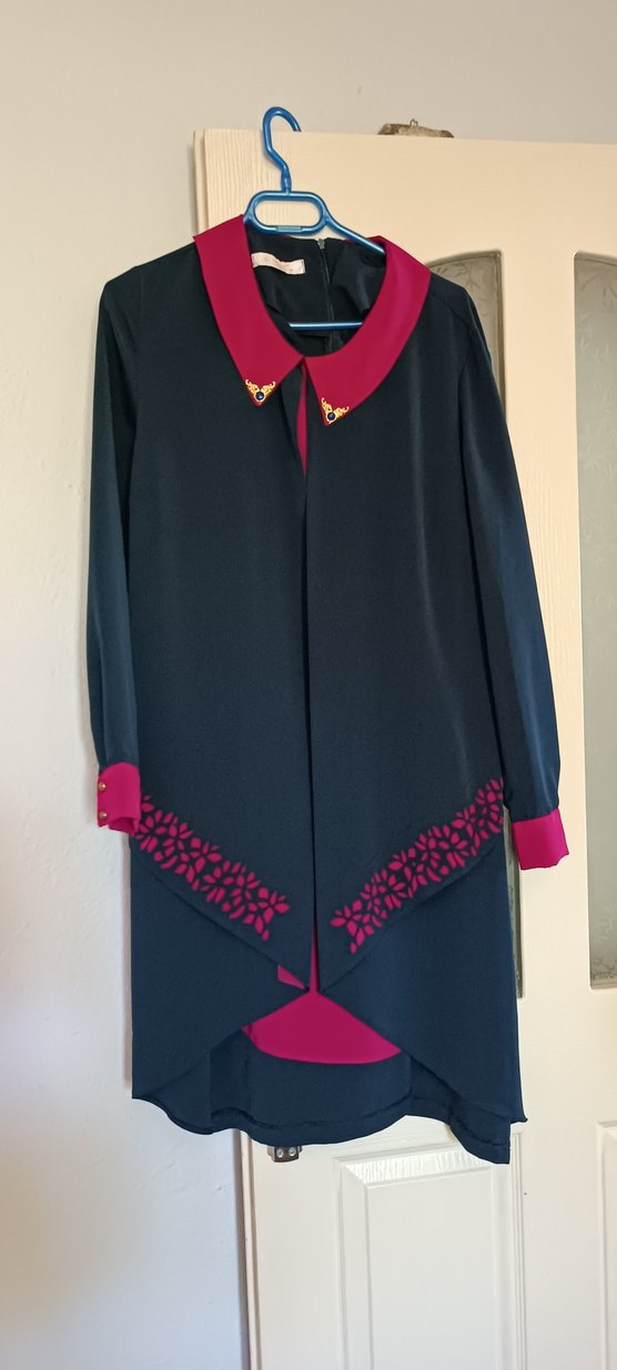Bordo detaylı, uzun kollu, dökümlü ve bol kesim kadın tunik. İpek gibi kumaştan, gotik tarzda ofis kullanımı için uygun.