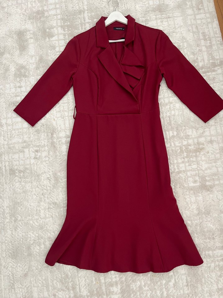 Bordo renk, dirsek kollu, yakalı ve fırfırlı detaylara sahip modern klasik tarzda, ofis için uygun midi elbise. Kendinden kemerli. Kemeri görsellere eklemeyi unutmuşum. Elbise ile aynı renkte kemeri mevcut. Trendyolmilla elbise. Hiç giyilmedi.