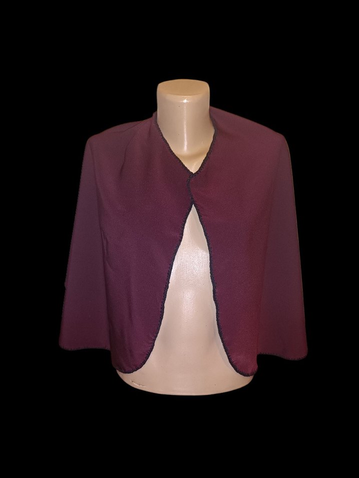 Bordo renkte, kolsuz ve dökümlü tasarıma sahip bolero. Notched lapel yakası ve bol kesimiyle yumuşak ve sıcak bir dokunuş sunar.