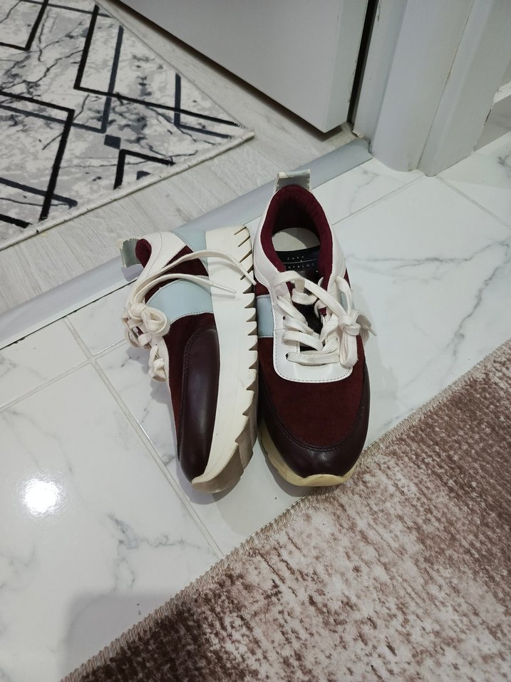 Bordo renkli, dolgu topuklu ve bağcıklı kadın sneakers, kauçuk tabanlı günlük kullanım için uygundur. Zara'nın orjinal ürünüdür.. sayılı giyildi. b.şehir. #zara