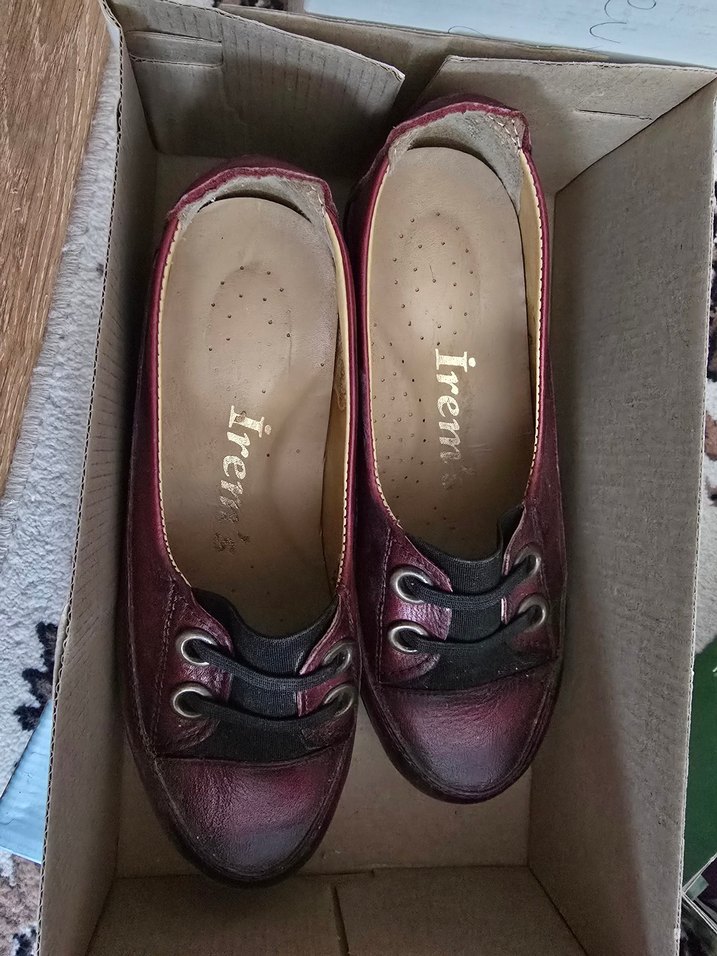 Bordo renkte dolgu topuklu, bağcık detaylı kadın ayakkabısıdır.