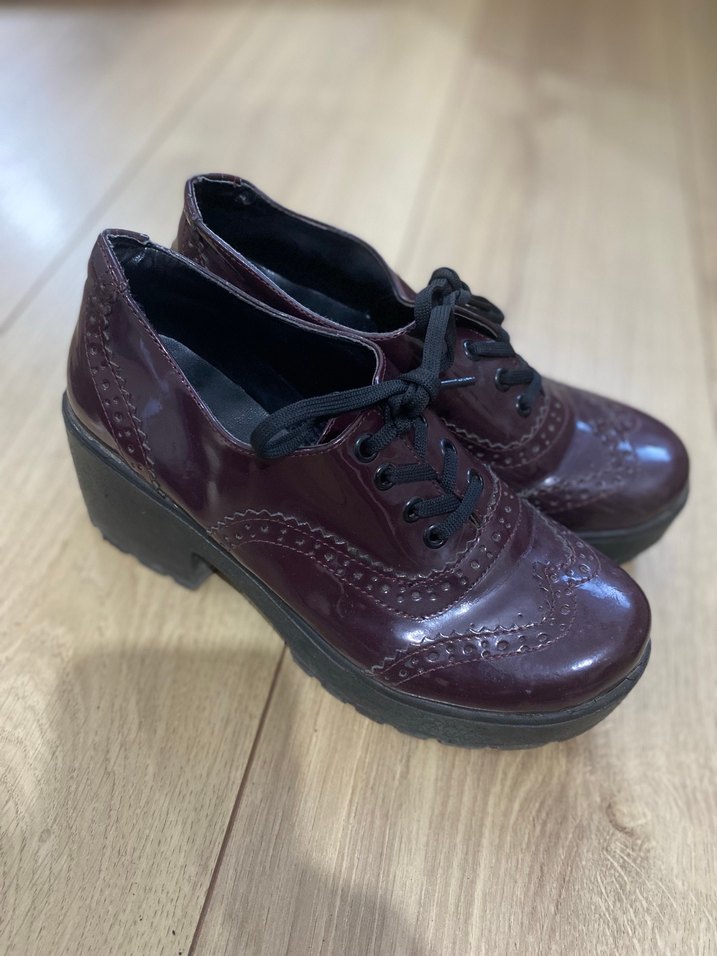 Bordo renkte, dolgu topuklu ve bağcıklı klasik kadın ayakkabısı. İyi durumda
