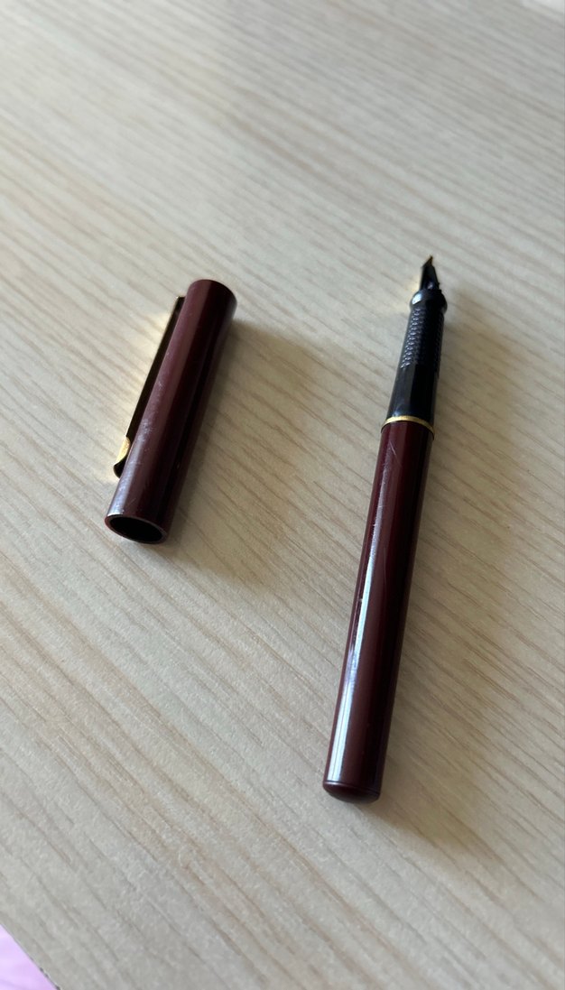 Bordo renkte, çıkarılabilir kapaklı ve ince uçlu dolma kalem. Yazımı akıcıdır. ️
