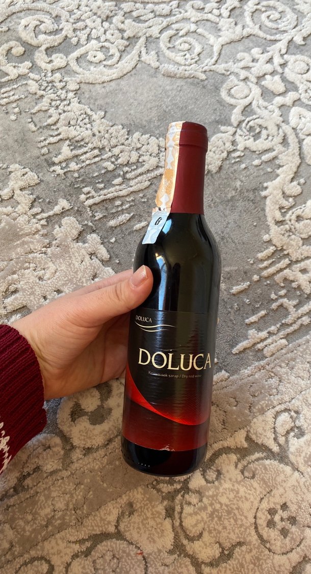 Klasik etikete sahip, bordo renkli Doluca kırmızı şarap şişesi, uyumlu kapak ile kapatılmış. Elimde iki tane var