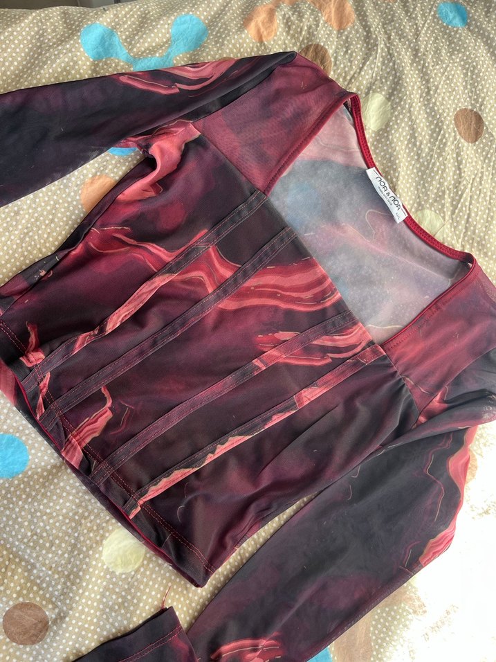 Bu dar kesim kadın bluz, bordo tie-dye desenli ve drape detaylıdır. Uzun kollu ve kare yakaya sahip, yumuşak sentetik kumaştan üretilmiştir.