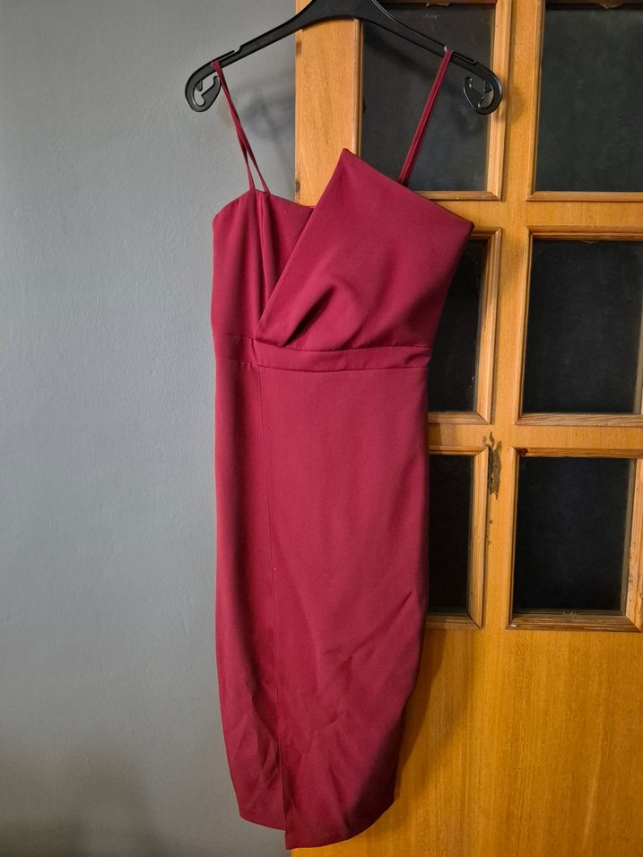 Bordo renkli, askılı ve drapeli detaylı, midi boyda, vücuda oturan abiye elbise. Minimalist ve çağdaş tarzda, romantik akşamlar için ideal.