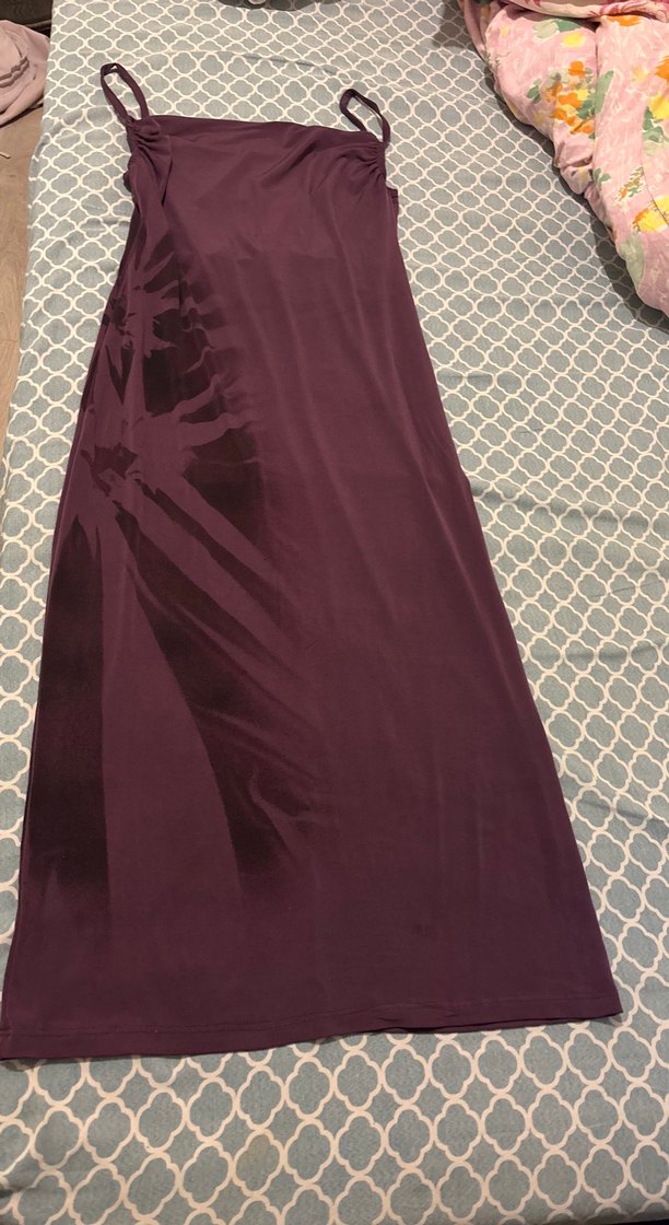 Bordo renkli, bağlamalı ve drapeli uzun elbise, ipeksi dokusuyla şık ve bohem bir görünüm sunar.