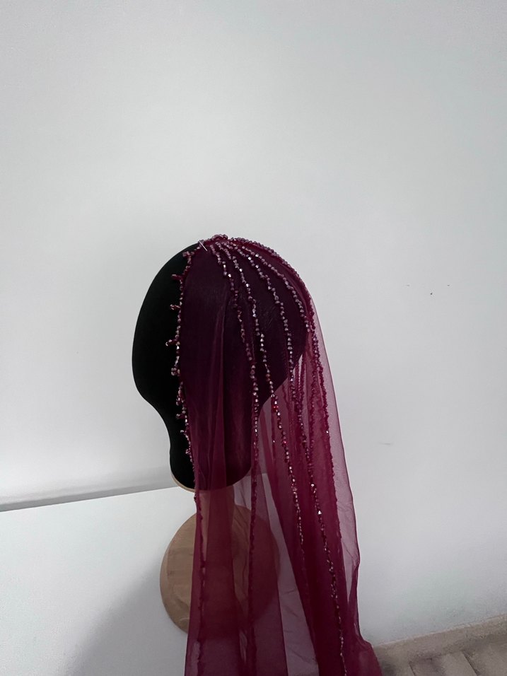 Bordo renkte, boncuk detaylı drapeli düğün aksesuarı. Gotik ve bohem tarzları birleştirerek retro ve gösterişli bir görünüm sunar.