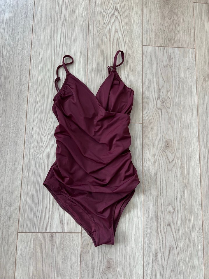 Bordo renginde, ince askılı, drapeli tasarıma sahip, vücuda oturan kadın mayo. Minimalist ve çağdaş stiliyle plaj için uygundur. S beden