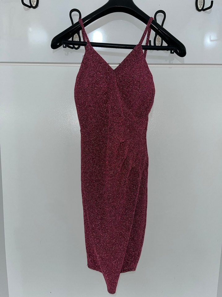 Bordo renkli, ince askılı ve V yakalı bu dar kesim elbise, drapeli tasarımıyla dikkat çeker. Midi boyda, şık ve iddialı bir gece elbisesi.
