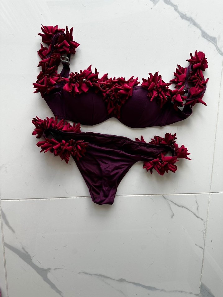 Bordo renk, drapeli ve askılı detaylara sahip, vücuda oturan kadın bikini takımı. Cesur ve avangart tarzda, desen içermeyen, parti için uygun.