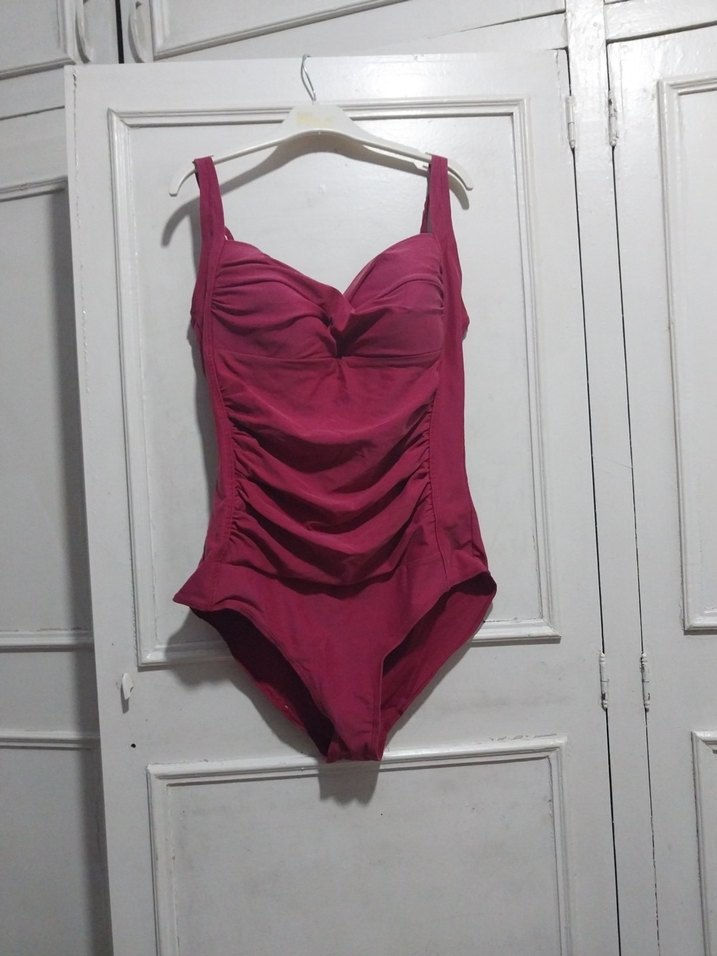 Bordo renk, drapeli detaylı ve askılı, vücuda oturan kadın mayo. Minimalist ve çağdaş tarzda, midi boy uzunluğunda ve desen içermeyen bir tasarıma sahiptir.