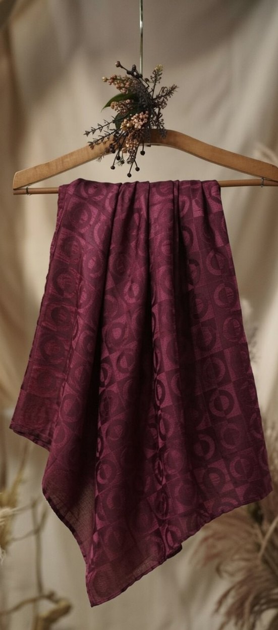 Bordo renkte, drapeli ve ipeksi dokulu kadın şal. Bohem ve rahat bir tarz sunar, koyu renk ve retro havası vardır.