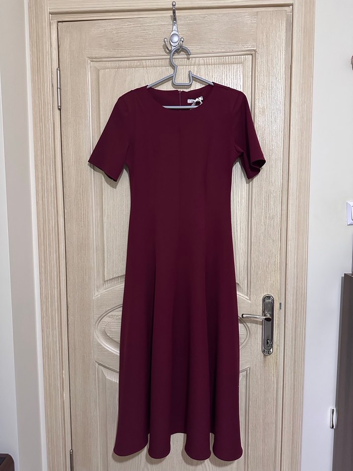 Bordo renkte, kısa kollu ve yuvarlak yakalı, drapeli tasarıma sahip uzun ve vücuda oturan elbise. Nişan nikah kına vs için uygundur. Yanında fuları da vardır