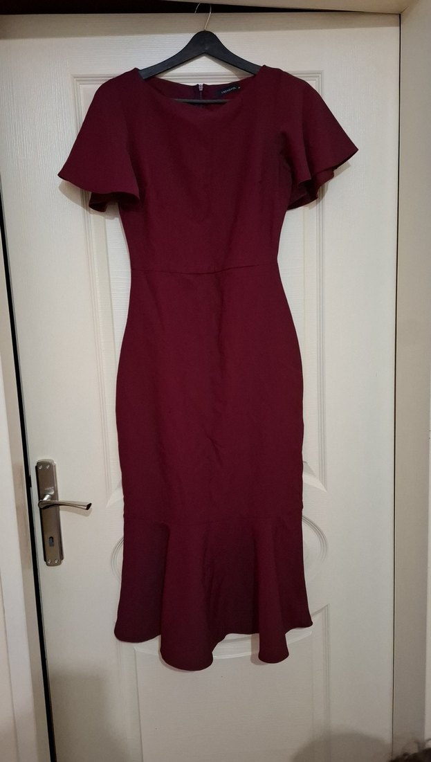 Bordo renk, kısa kollu, V yakalı ve drapeli detaylı uzun elbise. Ofis için modern klasik ve şık bir tercih. Kullanılmadı kusuru yok