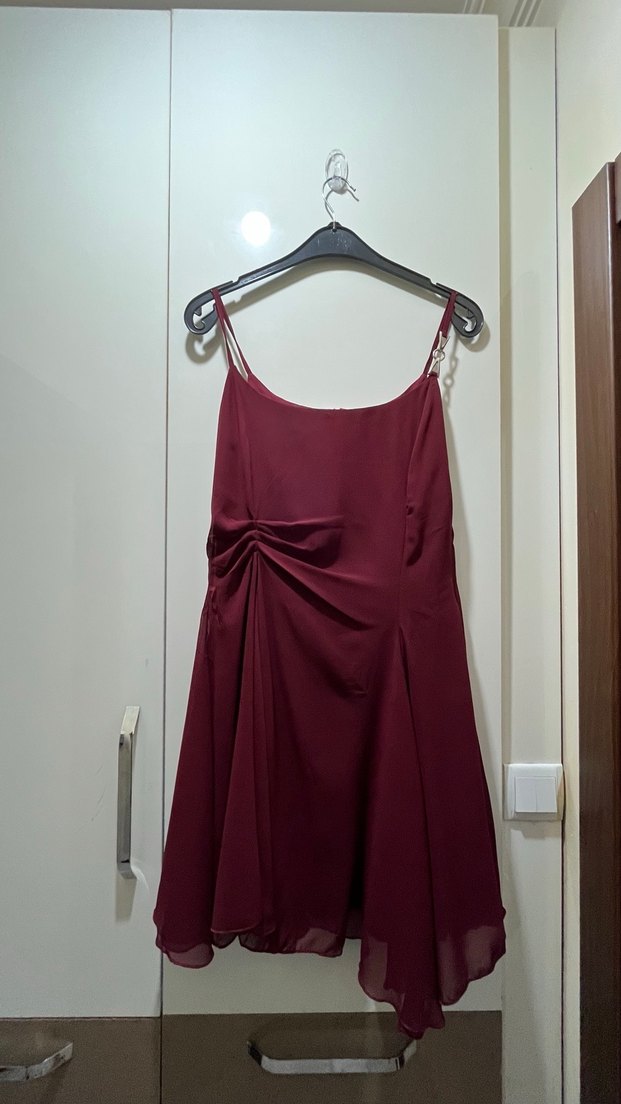 Bordo renkte, ince askılı ve drapeli tasarıma sahip midi abiye elbise. Gevşek kesimi ve sade şıklığıyla romantik akşamlar için ideal