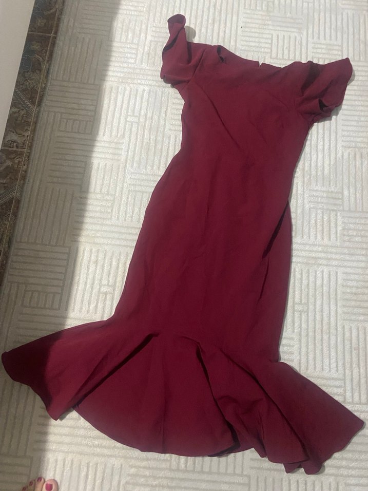 Bordo renkli, drapeli abiye elbise. Modern klasik tarzda, oturan kesimi ve kabarık etek ucu ile şık bir görünüm sunar.