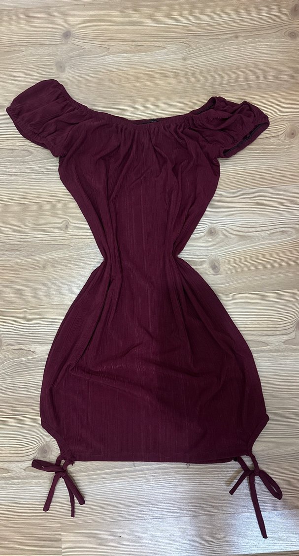 Bordo renkli, drapeli kayık yaka ve askılı kollara sahip, midi boyda ve vücuda oturan bohem tarzda rahat ve cesur bir elbisedir. xs-s uyumlu