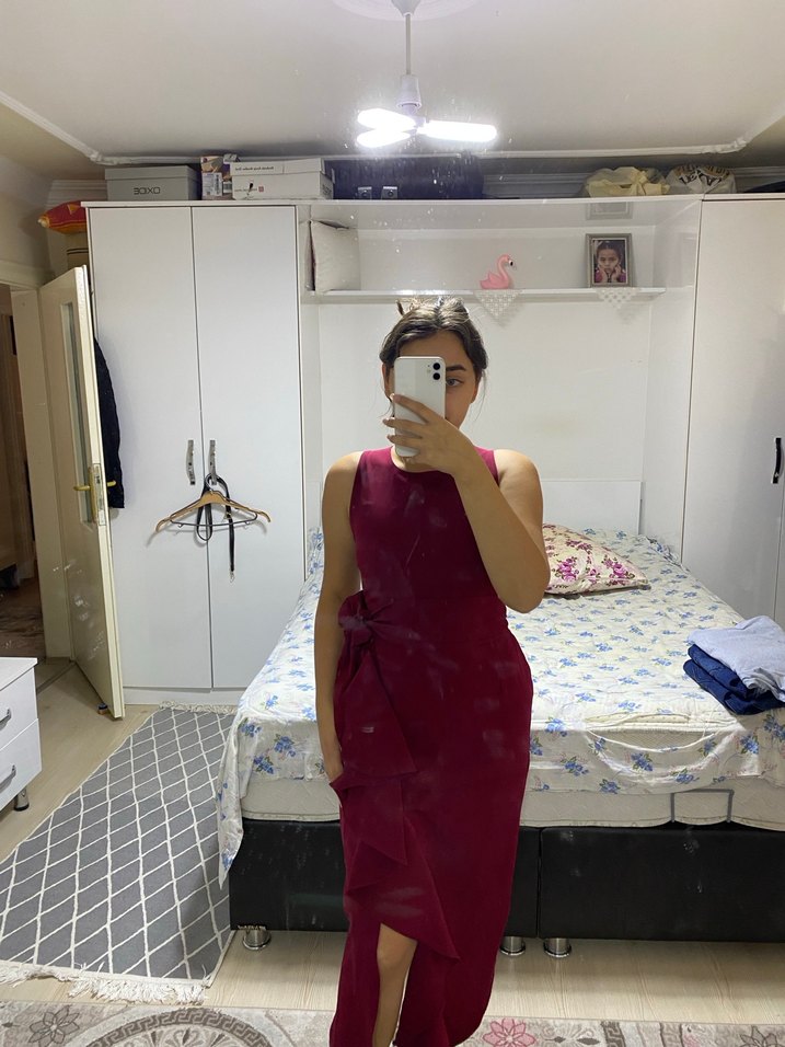 Bordo renk, midi boyda, straplez yaka ve drapeli detaylara sahip, fitted kesim elbise. Minimalist tarzıyla romantik akşamlar için uygun, modaya uygun ve trend belirleyici. s beden ama m beden de uygun olur. kemeri mevcut defosu yok