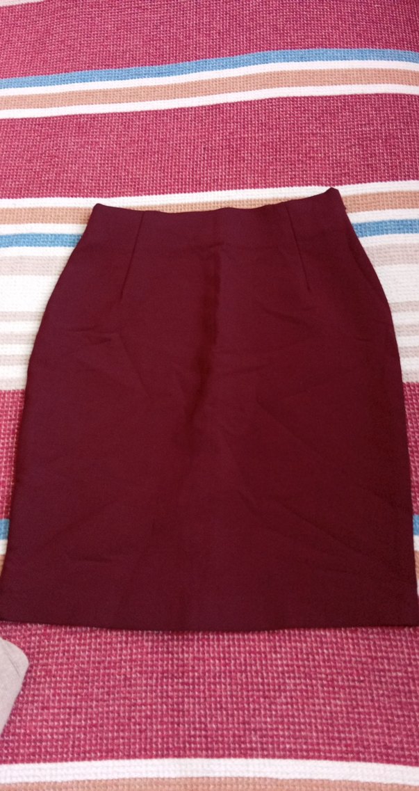 Bordo renk, drapeli detaylı midi kalem etek, sentetik kumaştan, ofis kullanımı için uygun.
