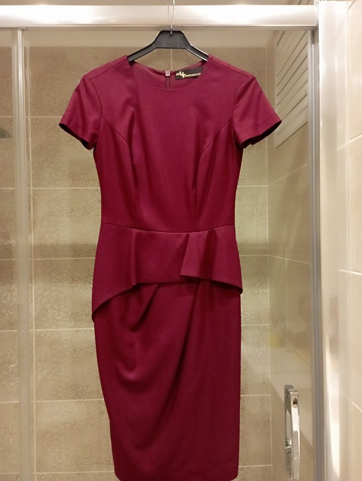 Bordo renkte, kısa kollu ve drapeli detaylı, midi boy klasik kesim kadın elbisesi. Ofis için uygun modern klasik tasarım.#adilışık