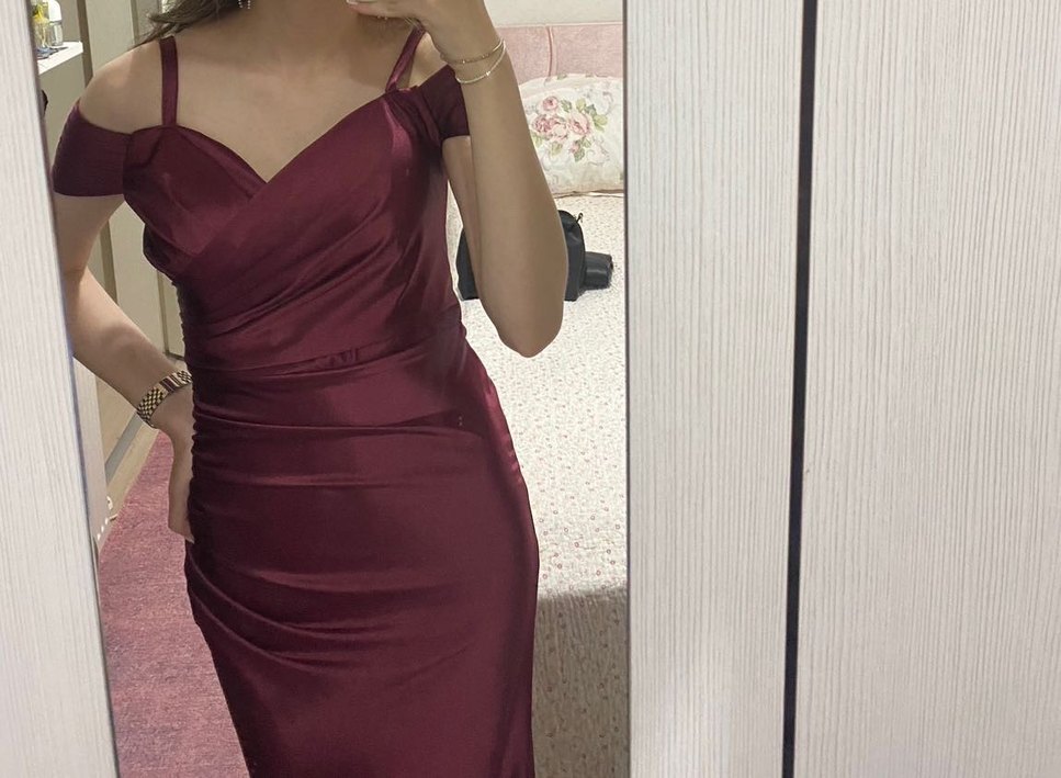 Bordo parlak kumaştan, drapeli ve V yakalı bu fitted nişan elbisesi, ince askılı ve midi boydadır. Düğünler için uygundur.