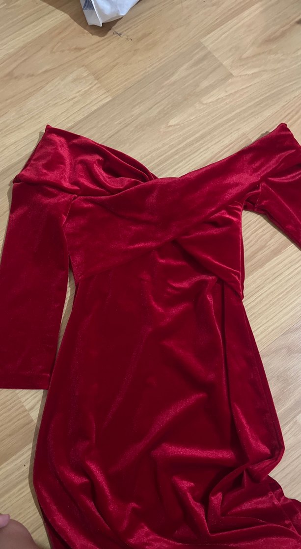 Bu bordo uzun abiye elbise, drapeli tasarımı ve tek omuz detaylı uzun kollu kesimi ile şık ve modern bir görünüm sunar. Parlak kumaşıyla dikkat çeker.