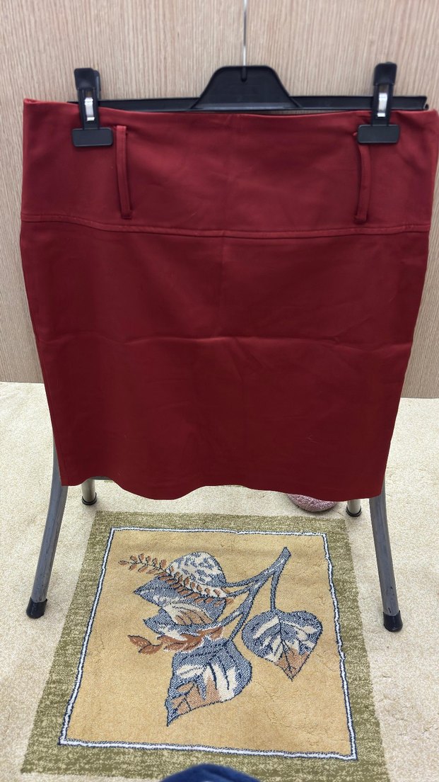 Bordo renkte, drapeli detaylara sahip, parlak görünümlü, sentetik kumaştan yapılmış dar kesim midi etek.