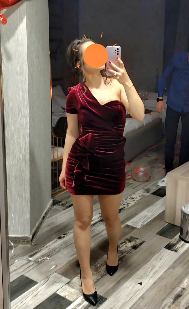 Bu bordo mini elbise, drapeli tasarımı, tek kısa kolu ve straplez yakasıyla dikkat çeker, cesur romantik geceler için ideal.