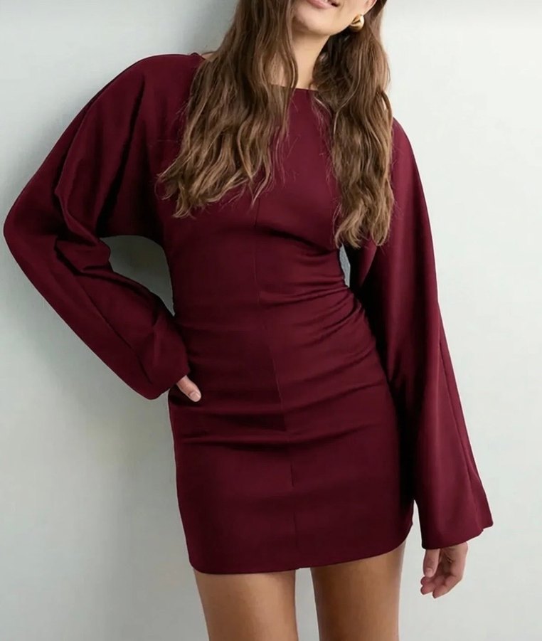 Bordo renk, yüksek yakalı ve uzun kollu drapeli mini elbise. İpeksi kumaştan yapılmış, romantik akşamlar için şık ve minimalist tarzda.