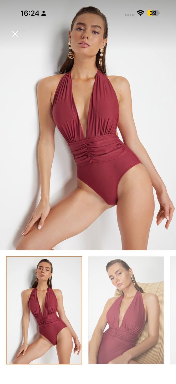 Bordo renk, derin V yaka, askılı ve drapeli bel detaylı mini kadın mayo, cesur ve şık bir plaj seçeneği sunar. ️göğüs kısmı bana büyük olduğu için kullanamıyorum. Aldığımda tatile gittiğimde kullanacaktım hiçbir şekilde kullanamadım hiçbir defosu yok