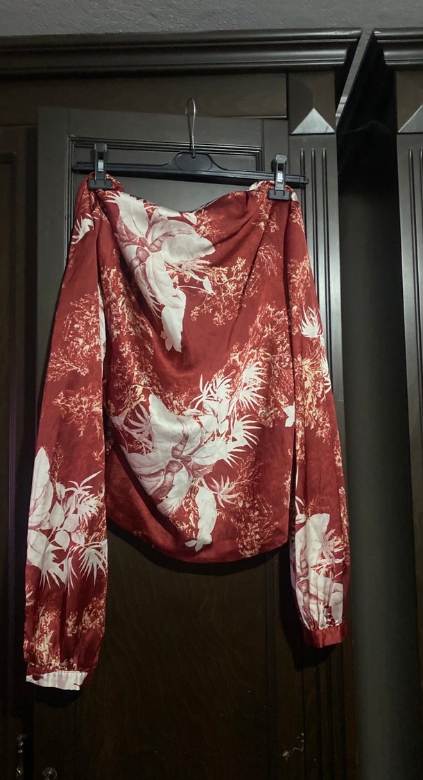Bordo renkte, straplez yaka ve uzun kollu, ipeksi kumaştan yapılmış bol kesim bir kadın bluzudur. Drapeli tasarımı ve batik desenleriyle bohem tarzı yansıtır.