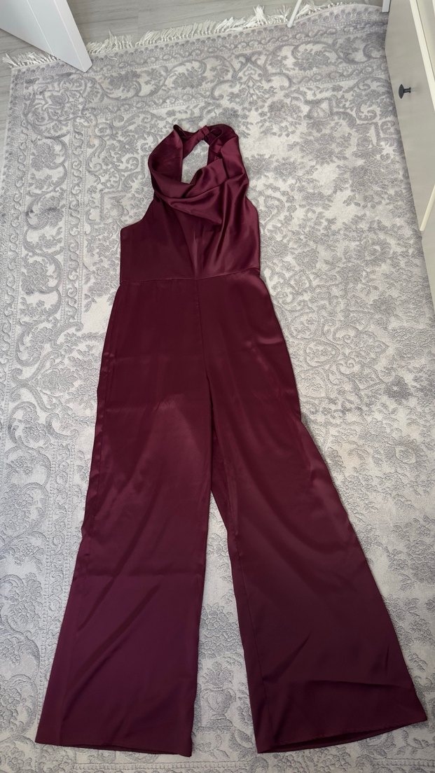 Kadınlar için uzun, bordo renkli, drapeli ve straplez yakalı, saten dokulu tulum. İnce kesimi ve kolsuz tasarımıyla düğünler için uygundur.