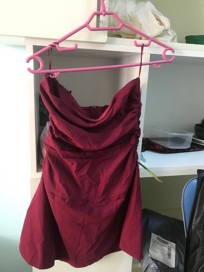 Bu bordo abiye elbise, straplez yakalı ve drapeli detaylara sahip. İnce askıları ve parlak dokusuyla romantik akşamlar için uygun.