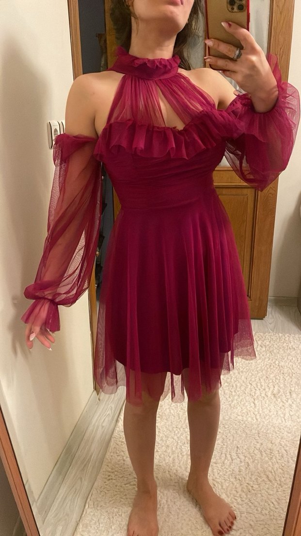 Bordo renkte, drapeli detaylara ve straplez kesime sahip, oturan midi boy elbise. Gösterişli ve cesur bir görünüm sunar.