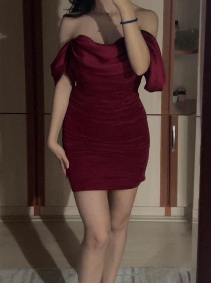 Bordo renk, straplez yakalı ve drapeli kollara sahip, vücuda oturan mini elbise. İpek gibi kumaştan, romantik gece için uygun.