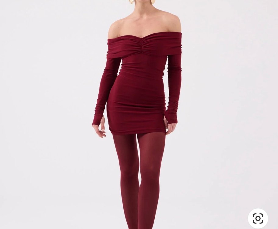 Bordo renkte, straplez yaka ve uzun kollu, drapeli detaylı, vücuda oturan mini elbise.