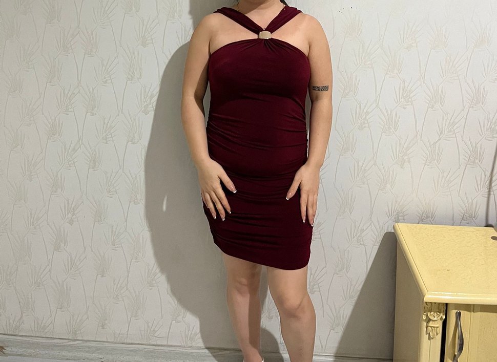 Bordo renkli, straplez yaka ve drapeli detaylı, vücuda oturan mini elbise. Pürüzsüz sentetik kumaştan, cesur ve göz alıcı tarz için uygun.