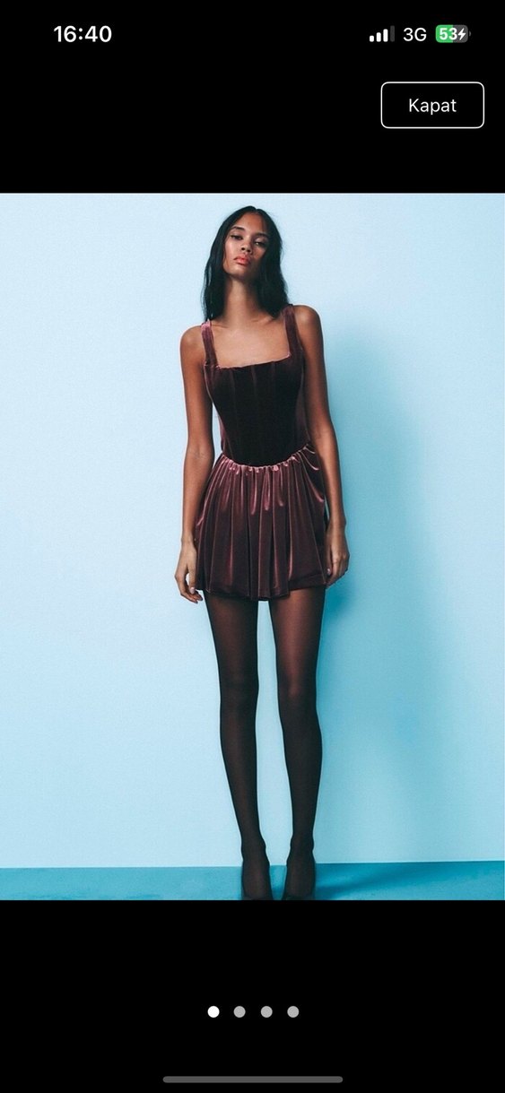 Bordo renkli, straplez yakalı ve drapeli detaylara sahip, ince ve mini kesim elbise. Parlak ve ipeksi dokusuyla romantik akşamlar için uygun.