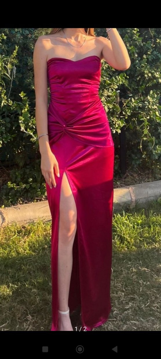 Cesur bordo uzun abiye, straplez yakalı ve drapeli detaylıdır. Parlak batik deseni ve yüksek yırtmaç içerir, gösterişli düğünler için uygundur.