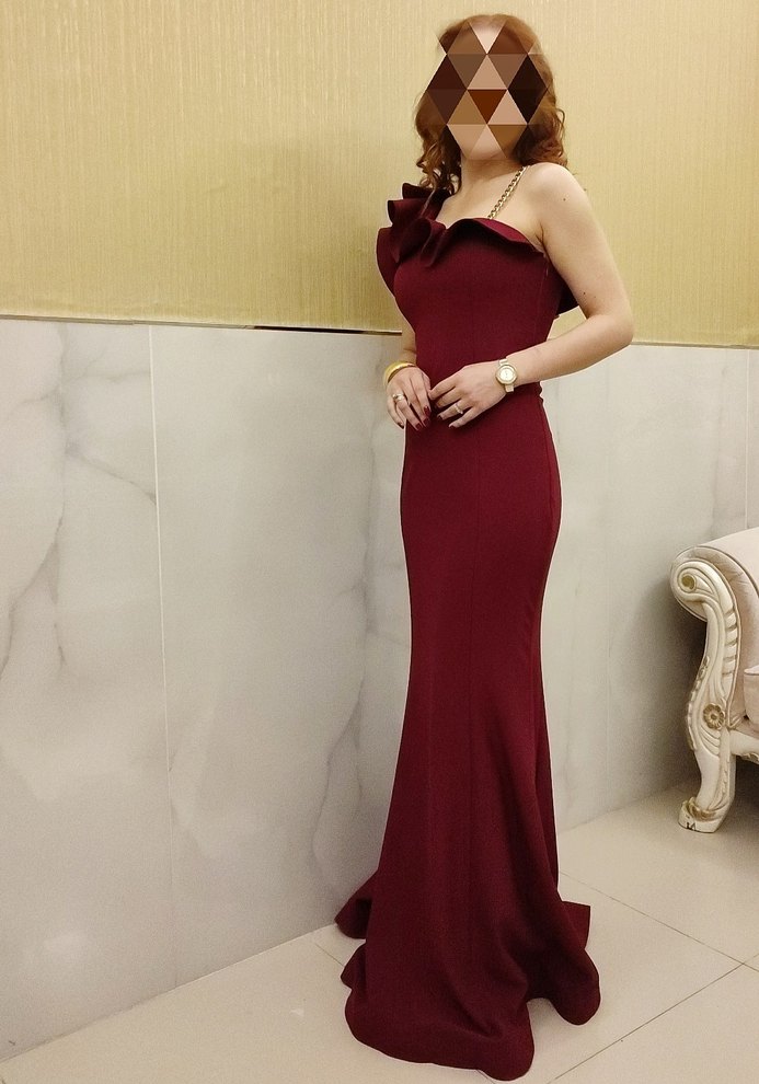 Bordo renk, tek omuz volanlı yaka, uzun ve parlak kumaştan yapılmış düğünler için uygun, kolsuz ve vücuda oturan abiye elbise. Zincirini çıkarıp kullanabilirsiniz. Sorunsuzdur defosu yok. Ürün 38 beden ama bel bölgesinde daraltma işlemi yapıldı. Vücut ölçülerimi fotoğrafların sonuna ekledim.